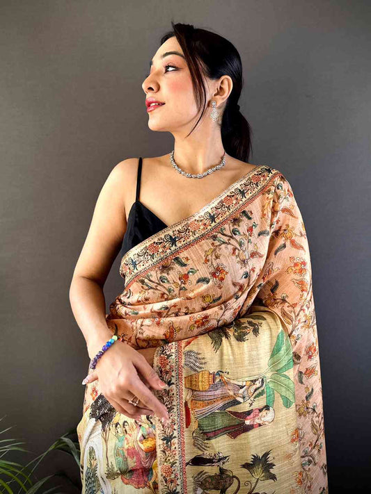 Peach Soft Silk Freehand Kalamkari Print Saree