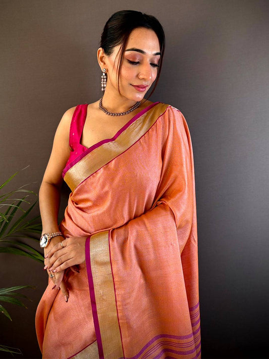 Peach Soft Silk Copper Zari Weaving Digital Floral Saree