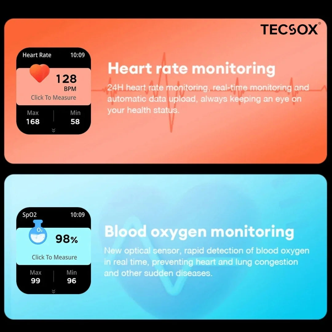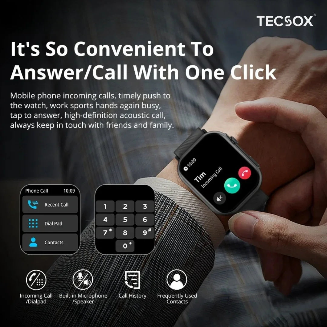 TecSox MaxGT4 Smart Watch features AI voice assistance, a 2.01" IPS display, IPX water resistance, multiple sports modes for a smart & active lifestyle. Key Features: AI Voice Assistance: Your smart personal assistant—right on your wrist. Control features, ask questions, and stay productive with just your voice. 2.01" IPS Display: A sharp, vibrant screen for seamless viewing and easy navigation. IPX Water Resistance: Perfect for workouts, rain, or everyday splashes—engineered to endure your lifestyle. Multi Sports Modes: From running to rowing, track a wide range of workouts with precision and real-time data. Sleep Monitoring: Analyze your sleep patterns and improve rest quality for better overall health. 24H Heart Rate Monitoring: Keep tabs on your heart health around the clock with continuous monitoring. Bluetooth Calling: Answer and make calls directly from your watch—stay connected even on the move. Customizable Watch Faces: Choose from multiple stylish designs to match your personality. Smart Notifications: Receive calls, messages, and app alerts without reaching for your phone. Why Choose TecSox Ultrawatch? 🗣️ Voice-Activated AI: Manage tasks, calls, and more—hands-free and hassle-free. 🧠 Smart Health Insights: Sleep tracking and 24/7 heart rate monitoring keep your wellness in check. ⚡ Long Battery Life: Long Battery performance on a single charge. 🏋️ Multi Sports Modes: Built for every athlete—track your workouts with precision. 📞 BT Calling: Talk directly from your wrist with built-in Bluetooth calling. 💦 Water-Resistant & Rugged: Withstands sweat, splashes, and storms. 🎨 Custom Looks: Personalize your watch face to fit your vibe. 🔔 Stay Notified: Instantly see texts, calls, and alerts—anytime, anywhere.