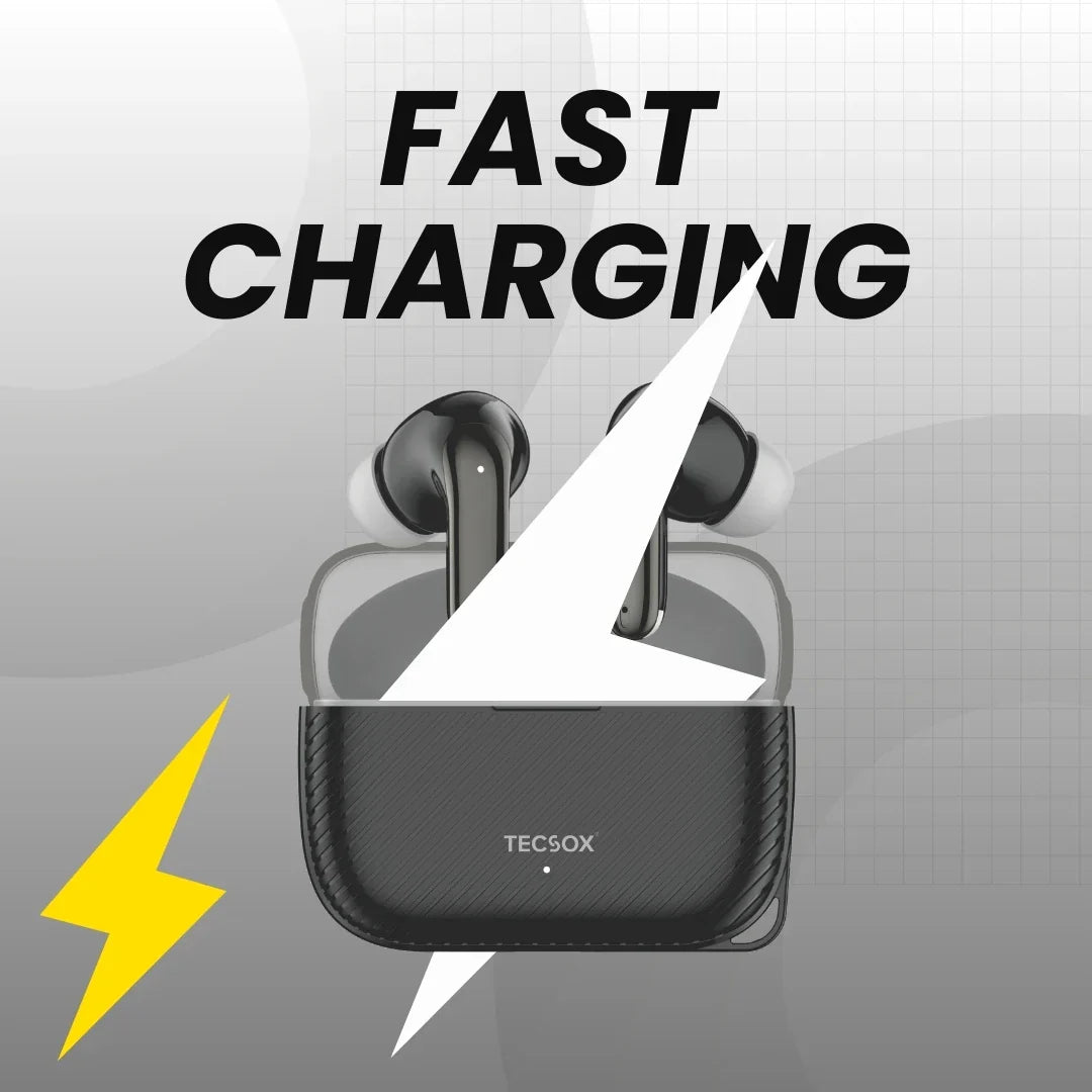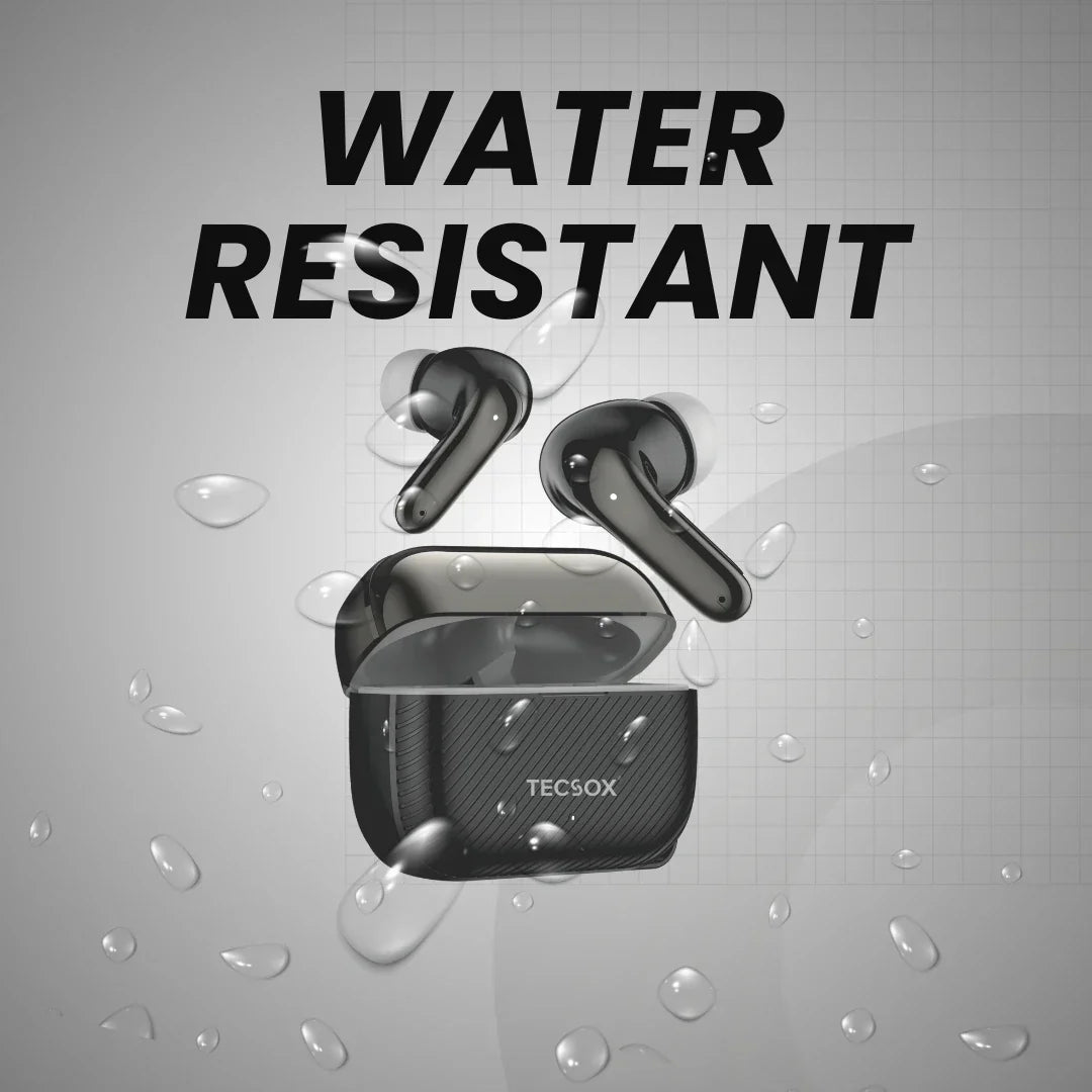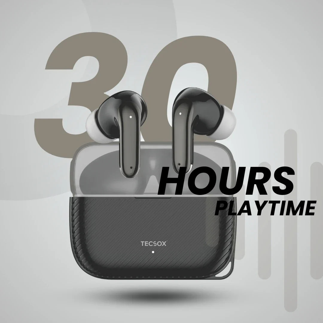 TecSox offers Pro 8 Bluetooth Earbud and High Resolution Audio, 30 Hr Playtime and IPX Water Resistant. Specification: Audio Quality: High-resolution sound for audiophile-level detail Battery Life: 30 hours of uninterrupted playtime Water Resistance: IPX-rated (resistant to sweat and rain) Bluetooth: Advanced Bluetooth technology for stable, seamless connection Fit: Ergonomic design for comfort during long use Use Cases: Ideal for commuting, workouts, or relaxation USP: Audiophile Sound: High-resolution audio that captures every detail of your music All-Day Battery: 30-hour playtime for non-stop listening Waterproof: IPX-rated for protection against sweat and rain Seamless Connectivity: Stable Bluetooth connection for uninterrupted audio Comfortable Fit: Ergonomically designed for long, comfortable listening sessions