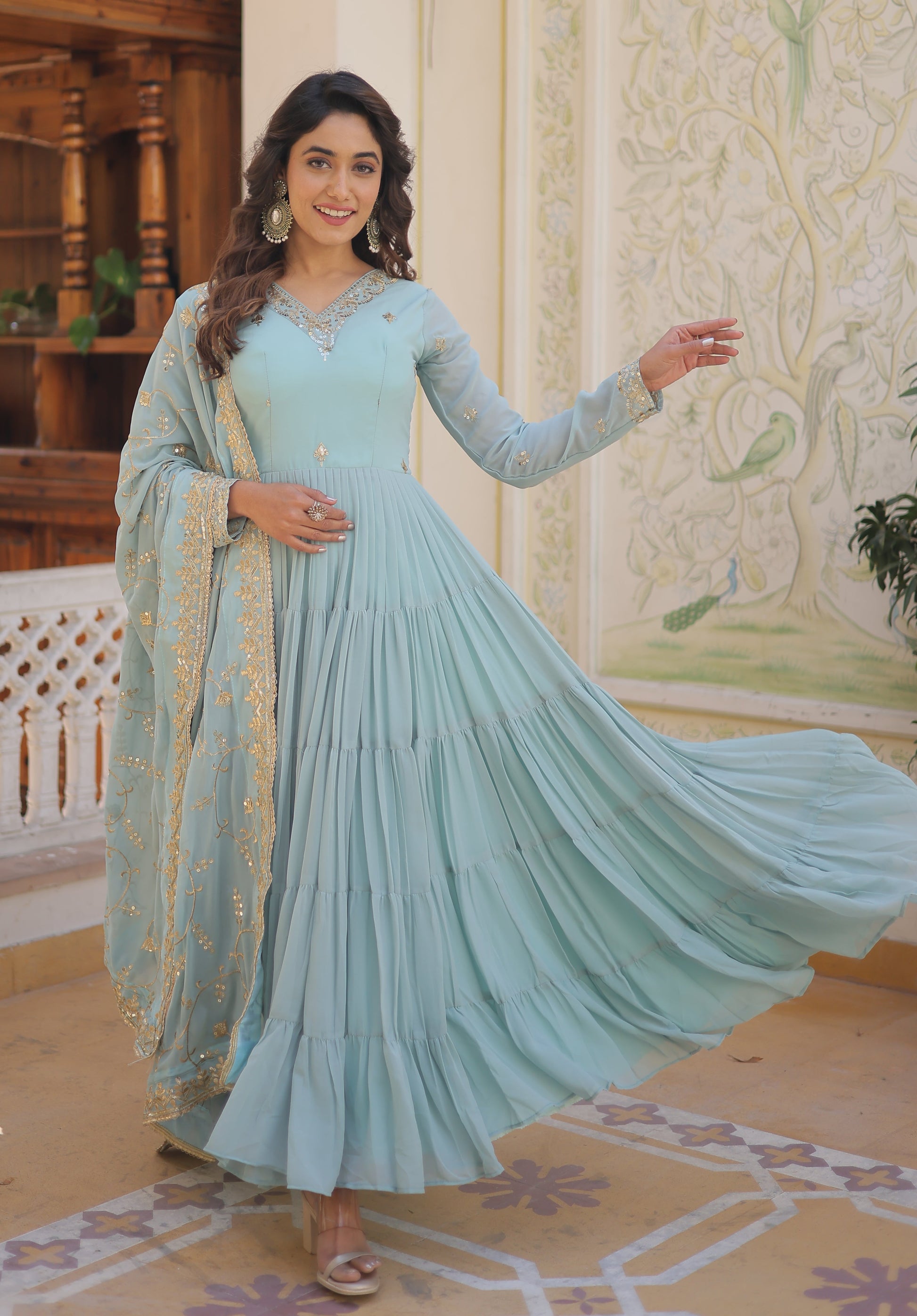 Product Name -Designer Georgette Sky Blue Kurta Set