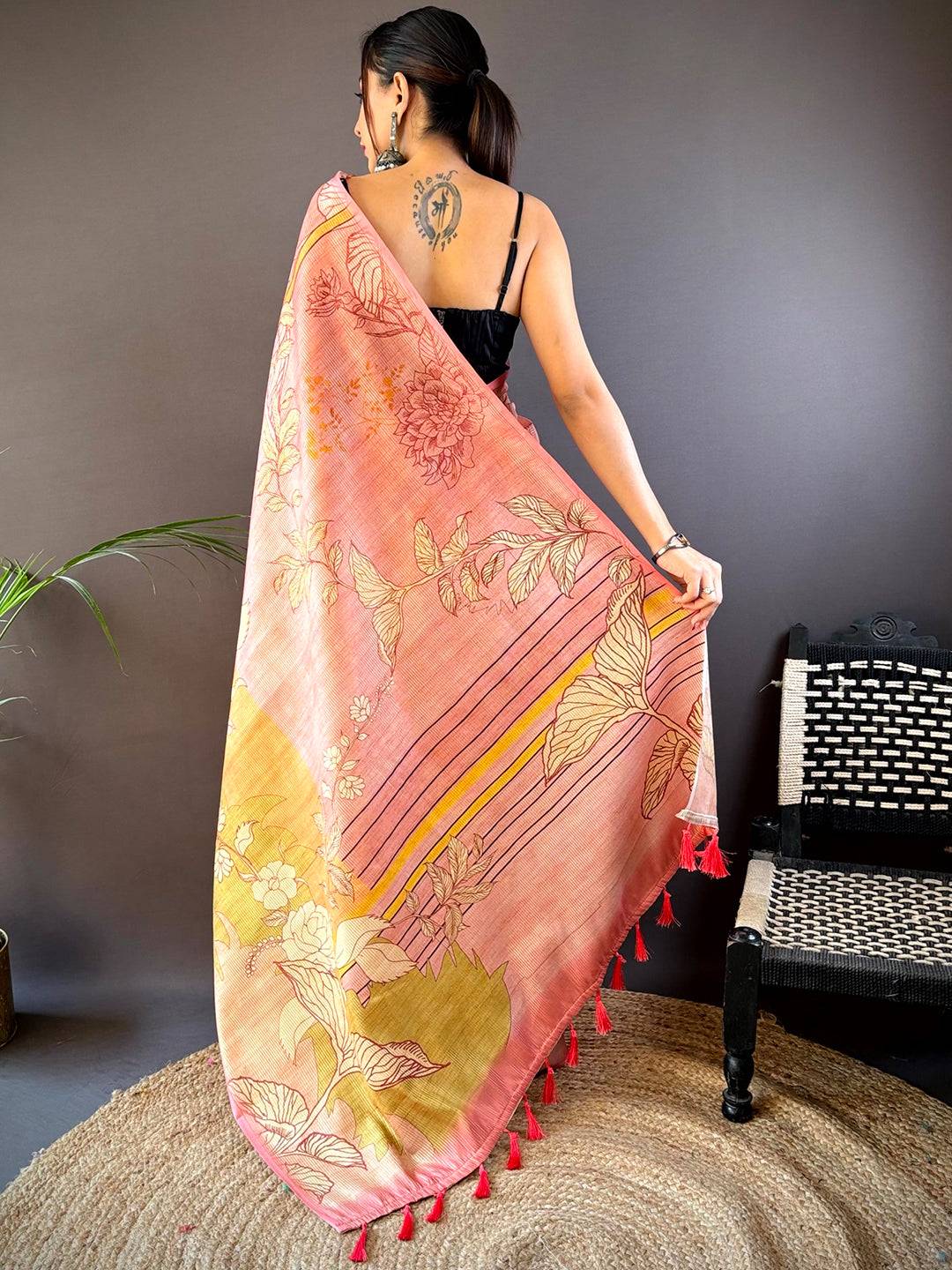 A Zari Tussar printed saree with a abstract Flower Print . Zari Tussar sarees are traditionally woven with a distinctive blend of Poly silk , known as Semi Maheshwari silk. These prints can include floral motifs, geometric patterns, or other artistic designs. The metallic threads used in the zari work can be gold in color .The pallu may showcase intricate weaving techniques and is a focal point of the saree's design. Maheshwari sarees are known for their lightweight nature, making them suitable for various occasions.