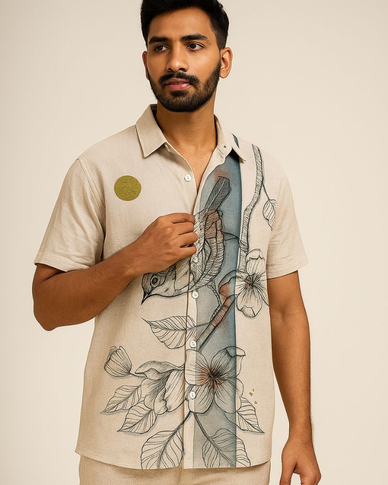 Casual white shirt with sparrow/bird with nectar graphics. Looks trendy and feels comfortable.