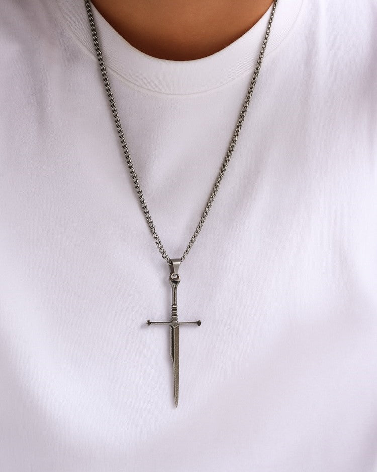 DESCRIPTION Stylish silver-plated sword pendant with chain. Lobster clasp for chain opening/closure. Pendant Type: Sword Shaped Material: Stainless Steel Plating: Silver Plated Pendant Height: 4 cm Chain Length: 50 cm