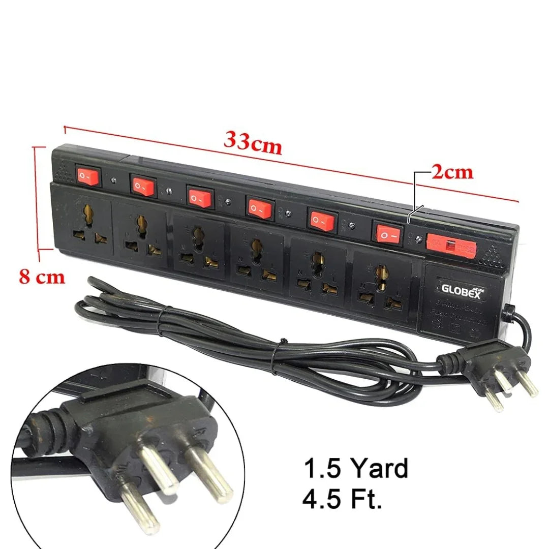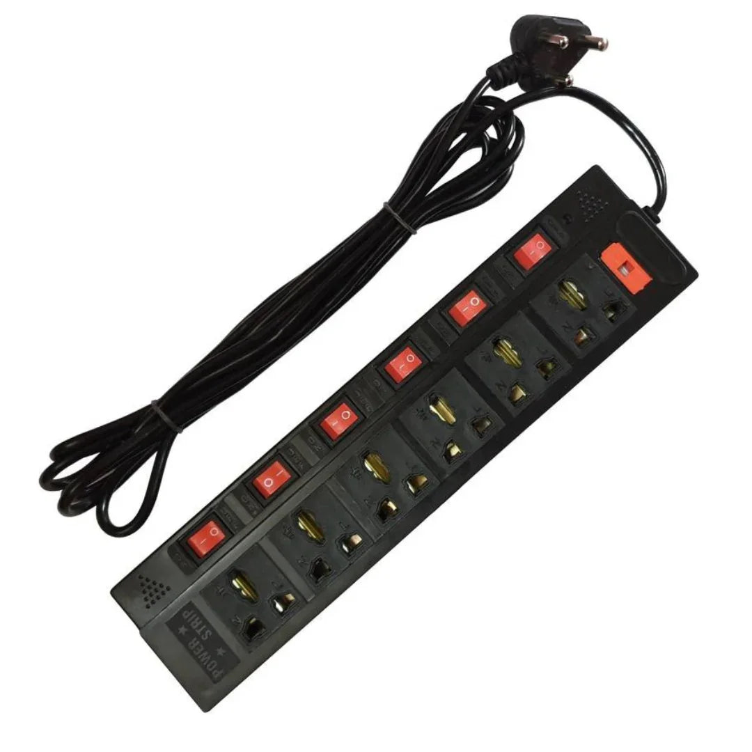 USPs (Unique Selling Propositions) 6 universal sockets for versatile connectivity Individual master switches for better control Built-in fuse for enhanced safety Long 2.7-meter cable for flexible placement Compatible with international plug types 🔹 Specifications Brand: TecSox Type: Extension Board Sockets: 6-pin Switches: 6 individual master switches Cable Length: 2.7 meters Safety: In-built fuse Socket Type: International compatible