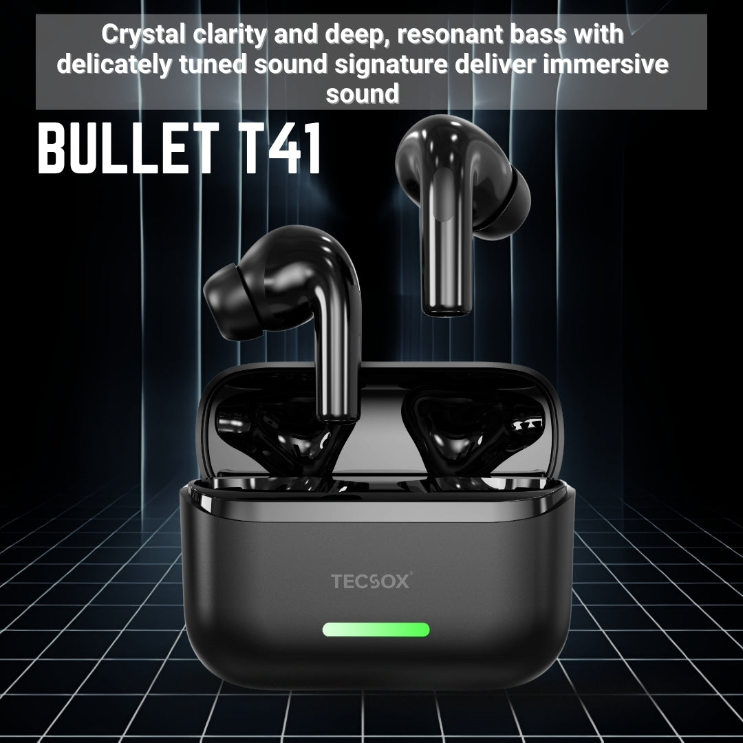 TecSox offers Bullet T41 Bluetooth Earbud and High Resolution Audio, 30 Hr Playtime and IPX Water Resistant. Specification: Audio Quality: High-resolution sound for audiophile-level detail Battery Life: 30 hours of uninterrupted playtime Water Resistance: IPX-rated (resistant to sweat and rain) Bluetooth: Advanced Bluetooth technology for stable, seamless connection Fit: Ergonomic design for comfort during long use Use Cases: Ideal for commuting, workouts, or relaxation USP: Audiophile Sound: High-resolution audio that captures every detail of your music All-Day Battery: 30-hour playtime for non-stop listening Waterproof: IPX-rated for protection against sweat and rain Seamless Connectivity: Stable Bluetooth connection for uninterrupted audio Comfortable Fit: Ergonomically designed for long, comfortable listening sessions