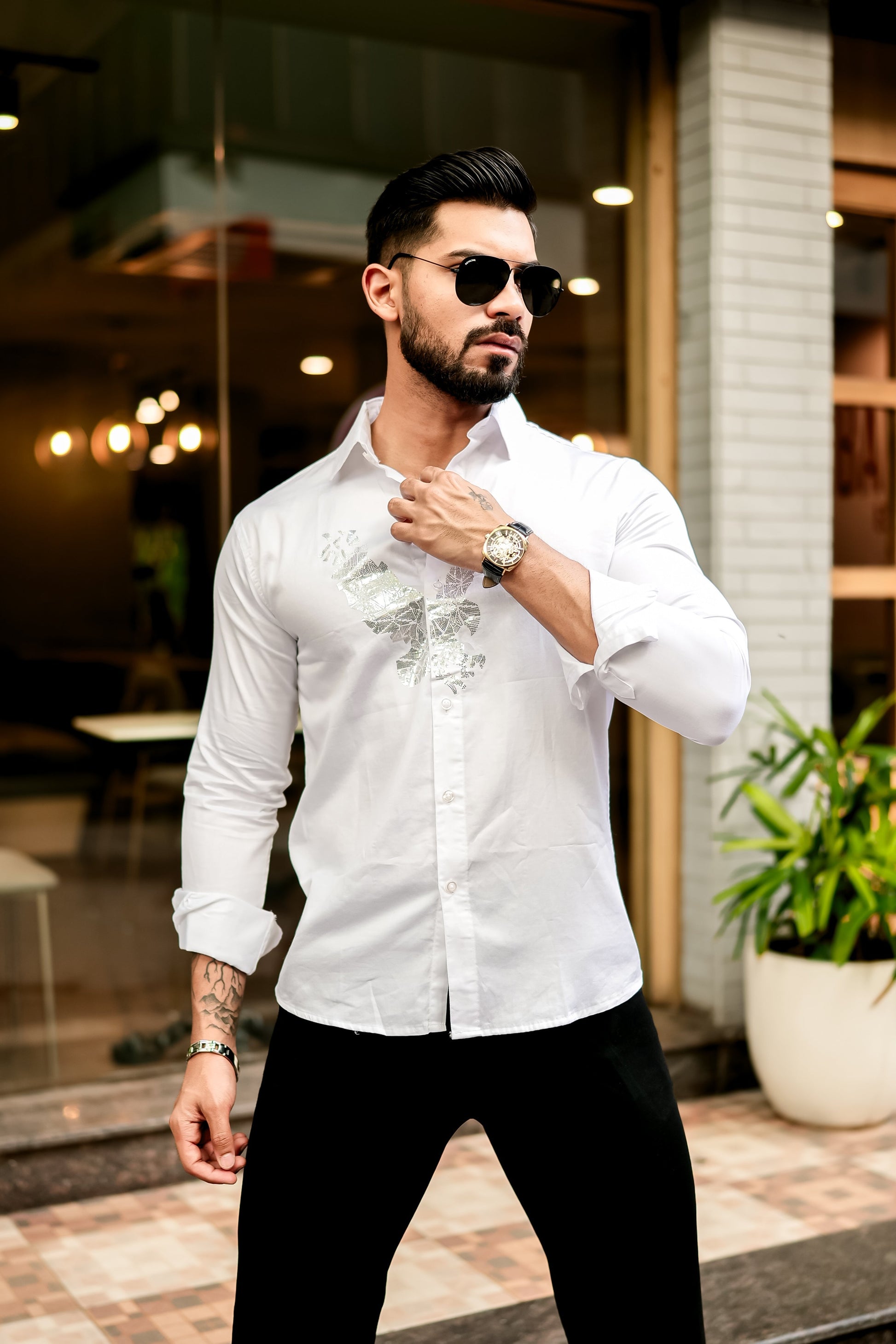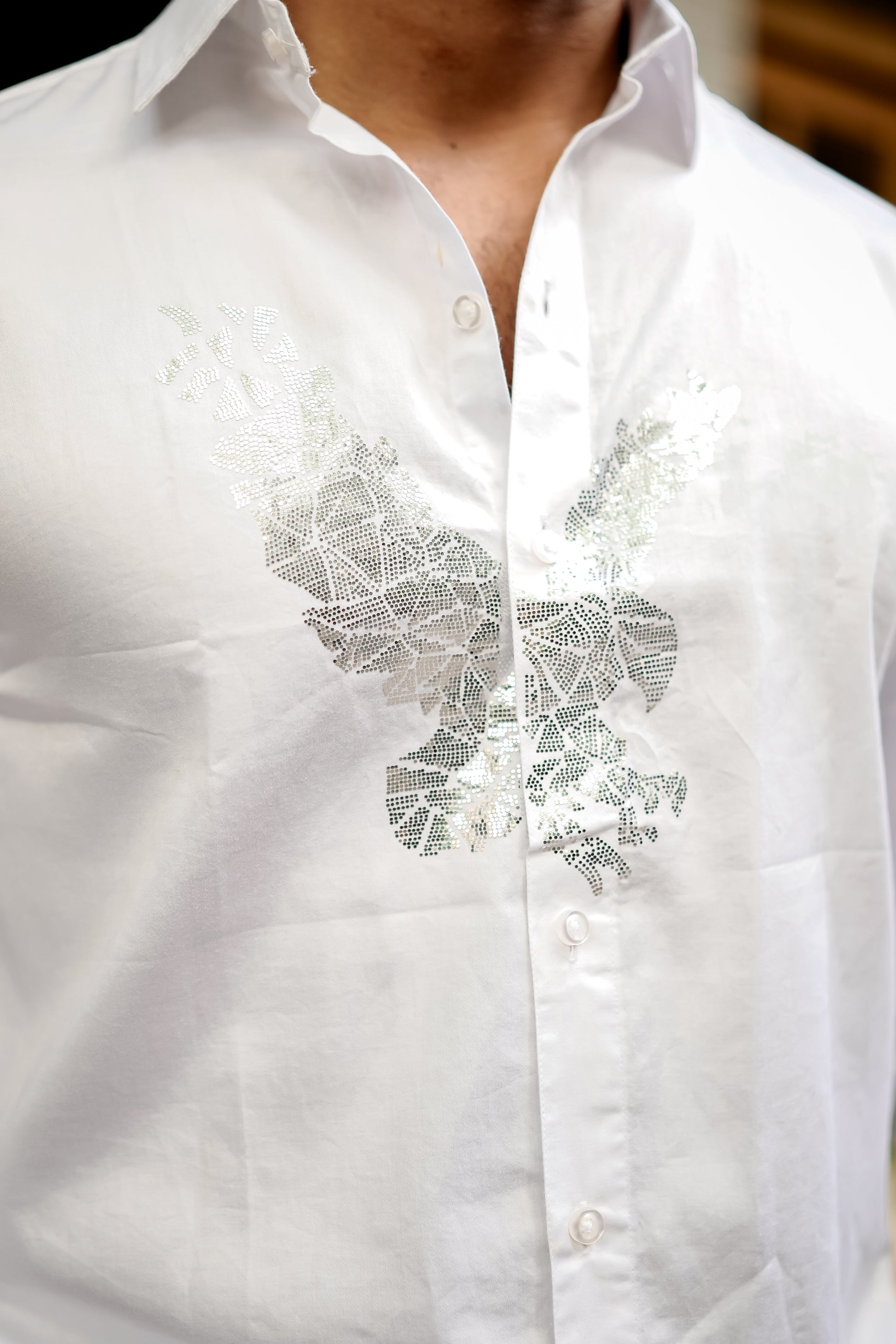 About The Product- White Bird embroidery premium satin cotton shirt , A Shirt That Is Stitched With Detailed Precision