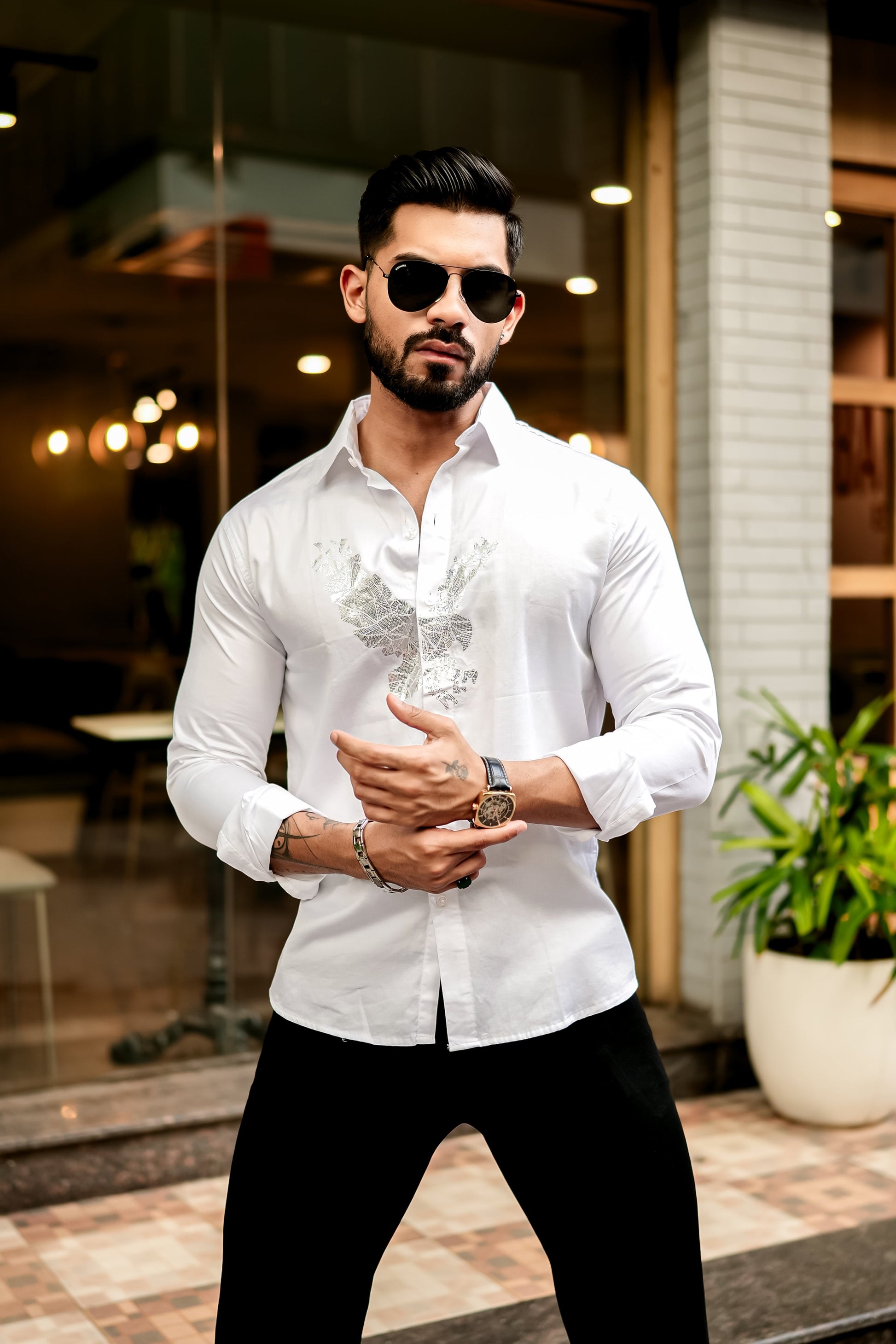 Trrendo White Luxe Embroidered Shirt Premium satin cotton shirt